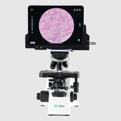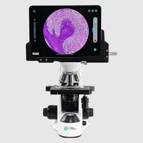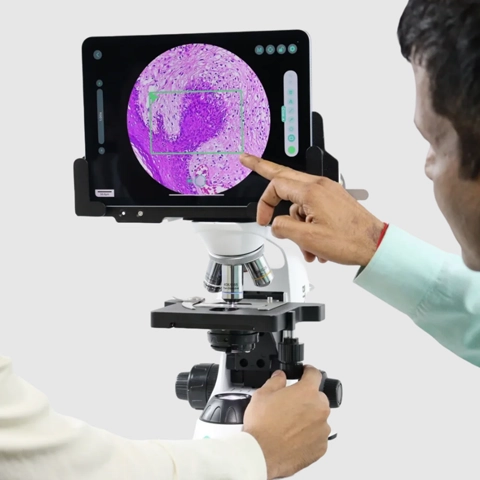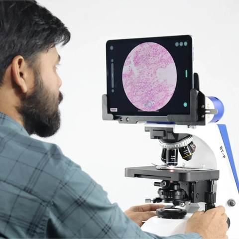 - Upright bright field digital benchtop microscope with tablet attachment at trinocular port making it compatible